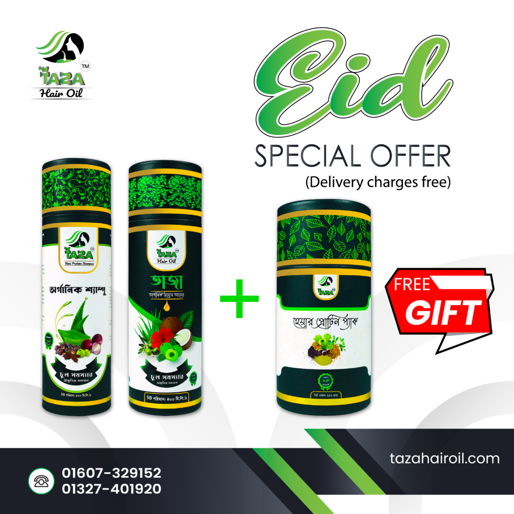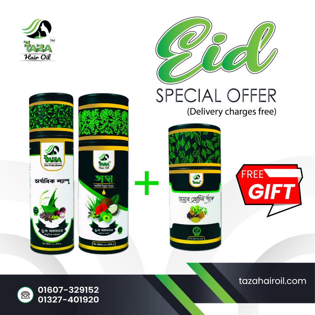 Get shiny, silky, and effortlessly manageable hair! Our 3-in-1 Taza Hair Care Combo brings together Taza Hair Oil (31+ natural ingredients), Taza Organic Shampoo, and Taza Hair Protein Pack for complete hair care. Taza Hair Oil nourishes your roots deeply. Taza Organic Shampoo gently cleanses while strengthening every strand. Taza Hair Protein Pack shields hair from sun and heat damage, tames frizz, and repairs split ends. With regular use, your hair becomes silky, shiny, and easy to style. Upgrade your hair care routine and give your hair the love it truly deserves.